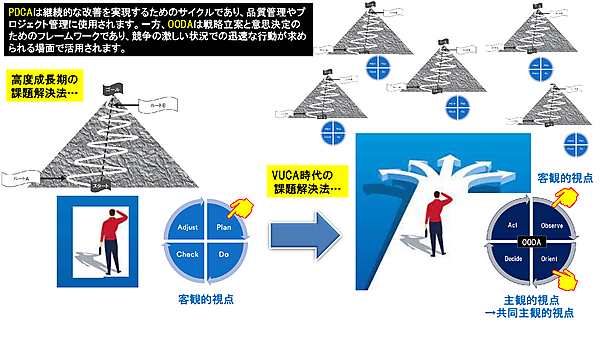 PDCAは継続的な改善を実現するためのサイクルであり、品質管理やプロジェクト管理に使用される。一方、OODAは戦略立案と意思決定のためのフレームワークであり、競争の激しい状況での迅速な行動が求められる場面で活用されるという。元々は軍事作戦に使われていた手法だ。しかし、ここでも日本特有の問題が出てくる。