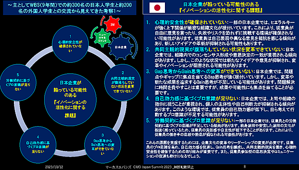 大久保氏は、早稲田大学ビジネススクール(WBS)にて9年間、約300名の日本人学生と約200名の外国人学生と交流してきた。そこから見えてきた考察として、日本におけるイノベーションの活性化の課題として、次の5つを挙げた。
