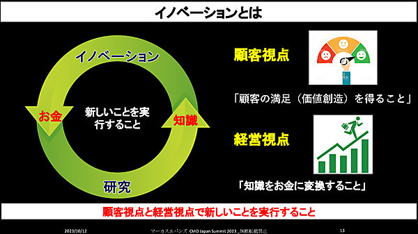 まずイノベーションとは、知識を使って新しいことを実行し、お客さんから『ありがとう』と言われて、お金をもらうことです。そして得たお金で、再び研究を行い、知識を生み出していくことです。日本では“技術革新”と訳されますが、そうではありません。企業の持続的成長をするためには、このサイクルが重要です(大久保氏)