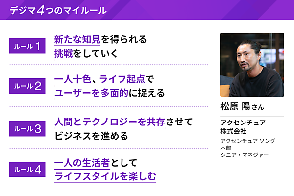 そんな松原氏は今「ライフ起点のマーケティング」を実践しているという。松原氏のキャリアや仕事に関する4つのマイルールについて聞いた。