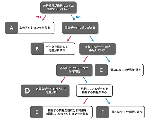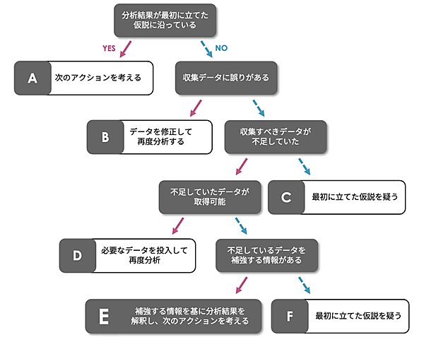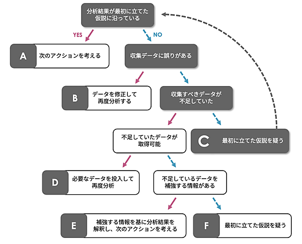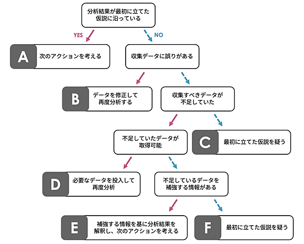 不足しているデータを補強する情報が見つからない場合は、最初に立てた仮説が間違っている可能性があります。仮説を疑い、必要に応じて再度仮説を立てて分析を行うようにしましょう。
