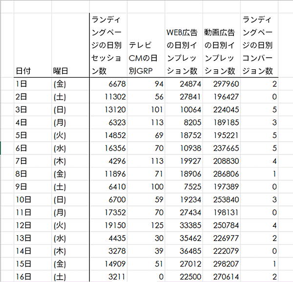 →対象期間のデータが一部取れていなかった - ランディングページのセッション数に、影響を与えたと思われる施策(この場合はテレビCMの日別GRP、WEB広告の日別インプレッション数)のデータ