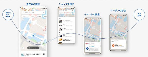 館内はGPSの細かい位置情報が届かないため、現在地を示すようなアクティブなマップの作成が難しいのですが、川崎重工さんの技術を活用し、精緻な現在地の表示を実現しました。これにより、現在地の確認はもちろん、近くの店舗情報やクーポン情報をマップ上で確認できるようになりました。