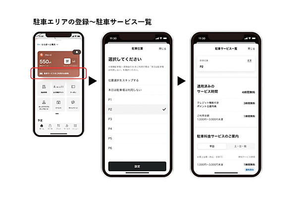 新アプリでは駐車場に関する悩みにも対応した。駐車エリアを登録できる機能を備えたほか、その日のお買い物実績や利用しているクレジットカードなどの会員種別に合わせて適用される無料サービスの適用情報がアプリ内で確認できるようになった。