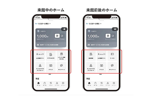 来館中と来館前後で、アプリのトップ画面に表示されるコンテンツを自動切り換えする機能も追加した。これにより、来館前〜来館中〜来館後で、顧客がその時に欲しい情報にアクセスしやすい仕組みになっている。