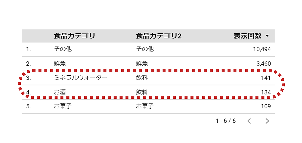 「ミネラルウォーター」と「お酒」のページがちゃんと「飲料」に統合されたか確認するため、ディメンション名を「食品カテゴリ2」として追加し、表示してみました。無事「お酒」と「ミネラルウォーター」が「飲料」として統合されています。