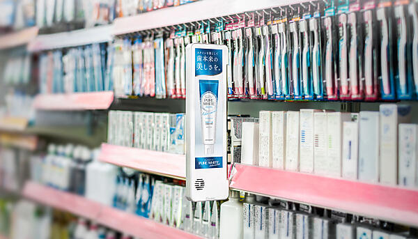 ストアギークサイネージは、約1年前から複数の大手ドラッグストアチェーンでのPoCや導入が始まっており、一定の効果が見られている。PoCでは、オーラルケアの商品が並ぶ定番棚に設置。複数メーカーの広告をローテーションで配信しながら約3か月間、運用した。