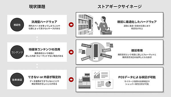 複数の大手ドラッグストアチェーンで実施したPoC(Proof of Concept:概念実証)では、設置によって対象カテゴリにおいて10%前後、訴求商品において20%前後、購買率が上昇したという。