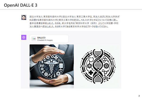 上図は、東京医科歯科大学と東京工業大学が統合にあたって、新大学のロゴをChatGPTに考えてもらった例だ。「医学と工学の両方の要素を取り入れることで、2つの大学の合併を表現しました」とある通り、医療・ゲノム・歯車などのモチーフがちりばめられている。