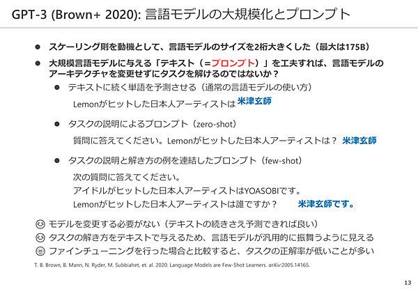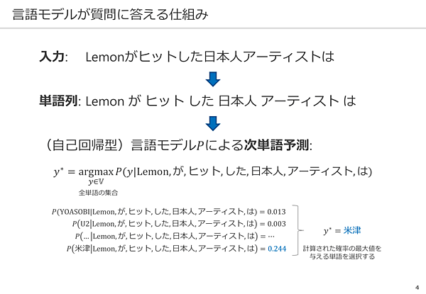 簡単に言うと、言語モデルとは 「Lemonがヒットした日本人アーティストは『○○』」のように、文章の次にくる単語を予測するという仕組みだという。