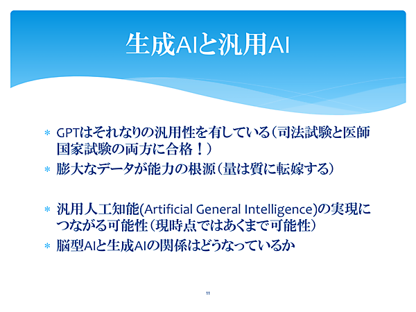 言うまでもなく、生成AIは現段階でも非常に優れた能力をもっている。アメリカの司法試験・医師国家試験ではどちらも合格点を取っており、文系理系問わず知能が高く、ある程度の汎用性があるといえる。