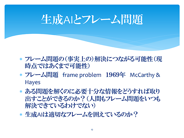 生成AIは色んな問題に対して適切に答えるので、フレーム問題に対応しているという意見もありますが、私はそもそも『フレームを囲っていない』というのが正しいと思っています。ただし、生成AIがこれを突破するためのヒントとなることは間違いないです(松原氏)