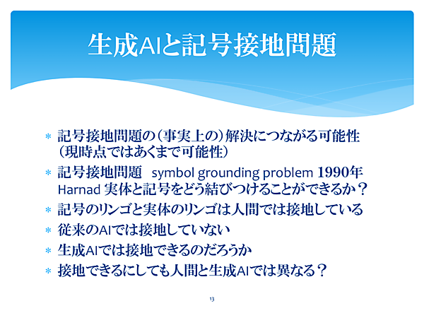 次に、1990年に認知科学者のStevan Harnad(スティーバン・ハーナッド)が提唱した「記号接地問題」だ。これは、「記号で指し示されるものと実世界の実体・概念とをどう結びつけるか」ということ。たとえば、「リンゴ」という記号と実際のリンゴ(食べる、赤い、酸っぱい)は、人間の中では接地(グラウンディング)しているが、AIは辞書的な意味を知っているだけで、人間のようには認識できないという問題だ。