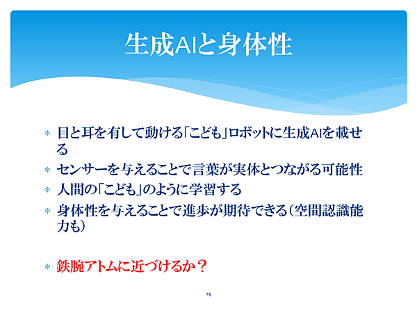 そこで近年進められているのが、「身体性」に関する研究だ。今世界中で、AI研究者・ロボット研究者が共同して、生成AIに身体を持たせる実験が行われているという。
