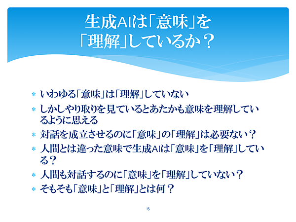 有力な説としては、『生成AIは生成AIなりに言葉の意味をわかっている』というものがあります。宇宙人とコミュニケーションが成立しているようなもので、お互いがどう理解しているかはわからないけれど、少なくとも対話できるという状態。