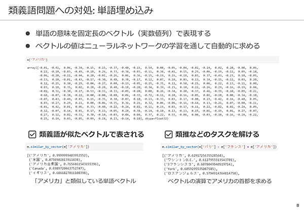 たとえば、「アメリカ」と類似している単語ベクトルを検索すると、「米国」「アメリカ合衆国」のベクトルがヒットする。人間にはわからない数字の羅列だが、コンピューターなりに類義語を理解していることになる。