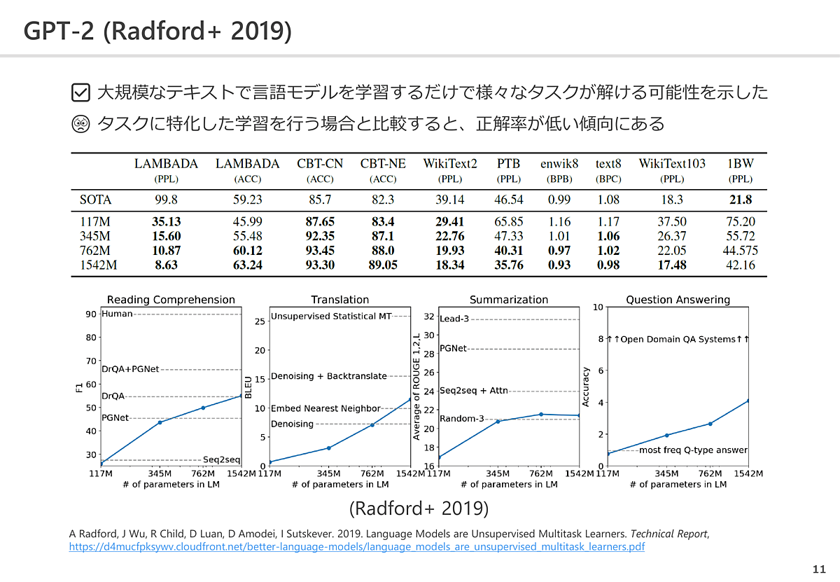 そうした議論の後に台頭したのが「GPT-2」だ。大規模なテキストで言語モデルを学習するだけでさまざまなタスクが解けるという可能性を示したが、「機械翻訳」など特定のタスクに特化したAIと比較すると性能面で劣っているという点が問題とされていた。