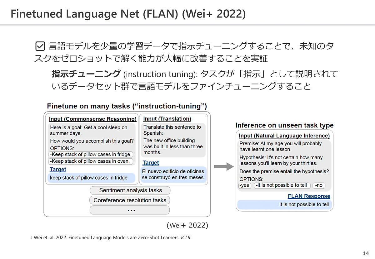 興味深い研究として、「指示チューニング」がある。これは、「指示」として説明されているタスクのデータを大量に学習させ、言語モデルをファインチューニングすることを指す。