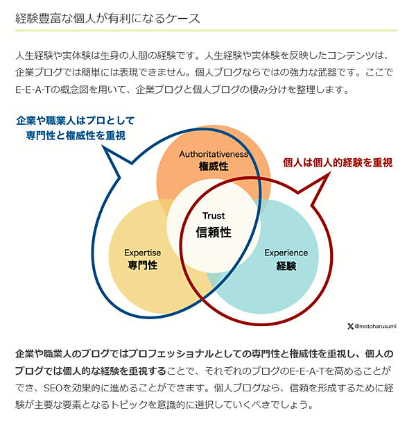個人ブログには、企業ブログのような専門性や権威性はないかもしれない。しかし、ブロガー自身の人生経験や実体験が豊富に反映されていれば、高い信頼性を確保できる。
