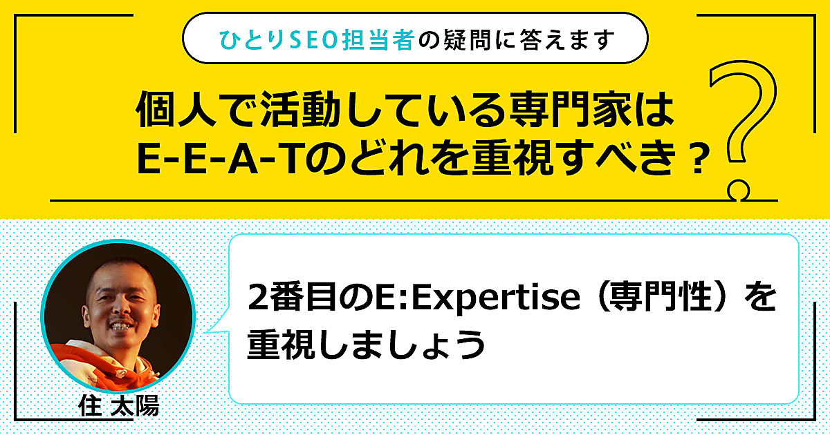 ひとりで頑張るSEO担当者さんの悩みに答える本連載。今回の質問は「個人で活動している専門家はE-E-A-T(Experience, Expertise, Authoritativeness, and Trustworthiness)のどれを重視すべき?」です。この回答は「2番目のE:Expertise(専門性)を重視しましょう」です。