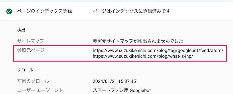 Search ConsoleのURL検査ツールでは、検証したページの参照元ページも調べられる。参照元ページとは、「そのページのURLをグーグルがどこで発見したか」のことだ。