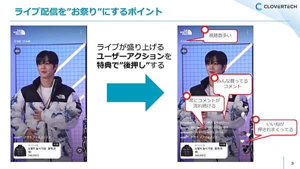 ライブコマース最大の“強み”は、「ショッピングのエンターテイメント化」にある。視聴者のリアクションをライブを盛り上げるコンテンツの一部として活用し、一体感を創出する仕掛けを考えよう。それができれば、直接的な売り上げを取れるだけでなく、顧客との一体感を高め、長期的にロイヤルティを高めることにも貢献するだろう。