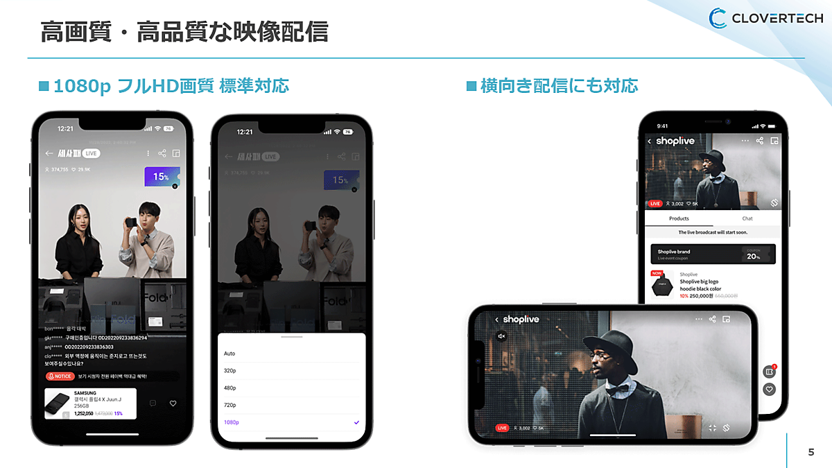 Shopliveは、最高1080pのフルHD画質でライブ映像を配信できる。画質は視聴者が自由に選べるほか、視聴者のネットワーク状況に合わせて動画の品質を自動で調整するモードもあるため、ストレスなく高品質の動画を配信できる。