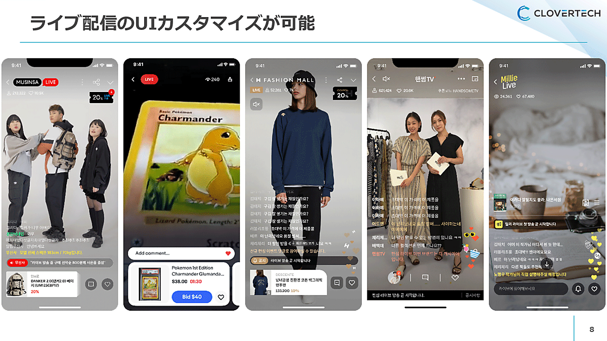 また、北米拠点のグローバルECモールへのライブコマース技術の提供も2022年6月から開始。現在はテスト段階として、一部のセラー(売り手)に対して、アプリ内で自由にライブ配信を開催できる機能を提供している。このECモールでは、毎日数十本のライブ配信が行われており、人の少ない深夜や早朝の時間帯でも複数のライブが配信されている。「コレクター」ジャンルでは、希少なトレーディングカードやコインなどを取り扱い、配信1回で数千万、数億円を売り上げる売り手も少なくない。さらには、売り手本人が書いた漫画をライブオークションで販売し想像以上の高値がつくなど、その可能性は幅広い。