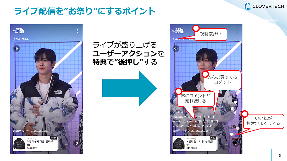 さらに、単に映像を見せるだけでなく、ライブ限定のクーポンを表示したり、ユーザーとコミュニケーションをとって配信を盛り上げたり、EC側と連携したさまざまな施策を実施できたりする豊富な機能が必要です。これまで、日本国内ではそうした機能も含めた魅力をもつソリューションがなかったのかもしれません(キム氏)