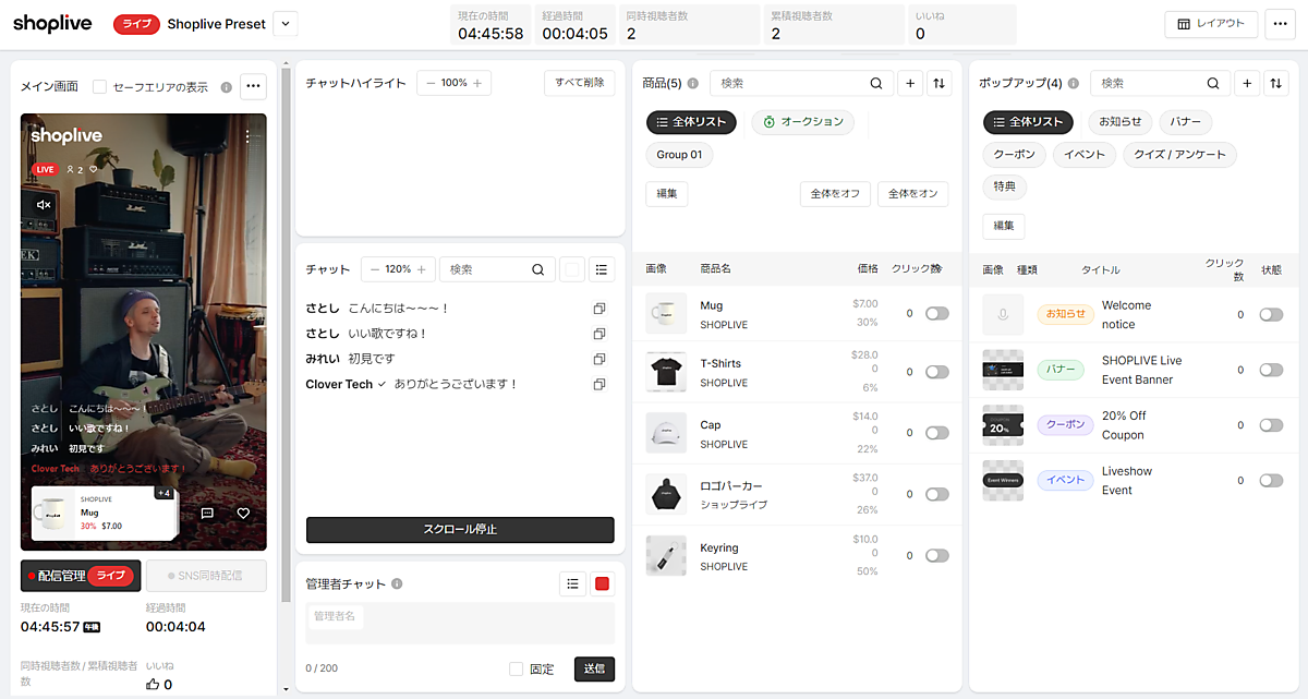 日本企業に喜ばれるのが、Shopliveは管理画面もマニュアルもすべて日本語にローカライズされているという点だ。データ分析ページなども日本語で見られるため、感覚的に分析結果を把握しやすい。管理画面やダッシュボードが英語というツールがまだ多い中で、作業のしやすさは大きなアドバンテージと言えるだろう。