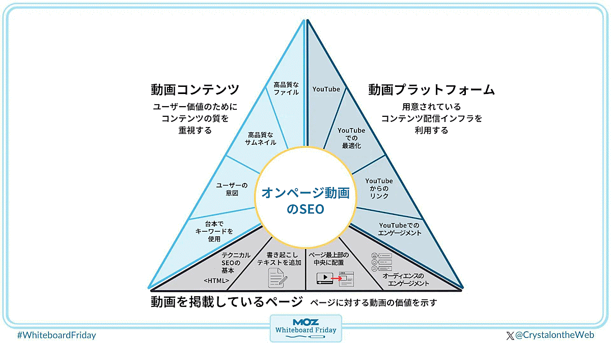 その理由として、グーグルはオンページ動画のSEO向けに多くのパラメータや技術的な仕様を設定しており、YouTubeではデフォルト設定でその多くに対応しているからだ。そのためYouTubeを使えば、「これはこうだろうか、あれはああだろうか」と考える手間が大いに減る。
