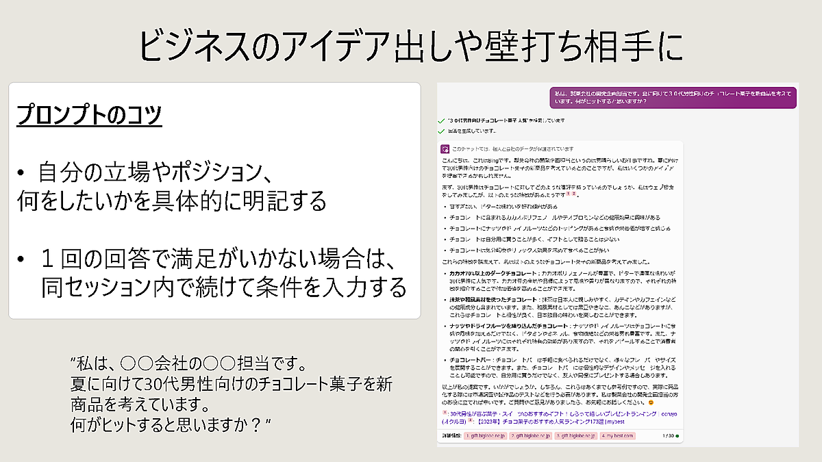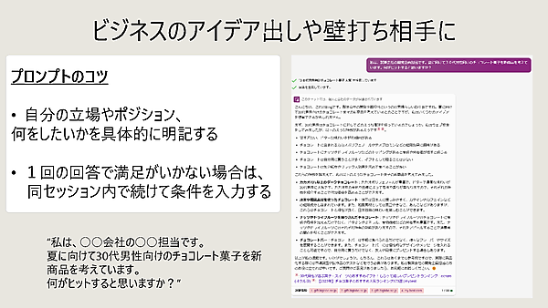 有園 ぜひ使ってみてください。コツはできるだけ具体的に質問すること。たとえば、アイデア出しで「おもしろい企画」ではなくて、「30代の男女マーケターをターゲットとしたイベントの企画をします。ターゲットにウケるタイトル案を5つ考えてください」というように、定義や条件を細かく設定したほうが、より役に立つアイデアが出てきますよ。