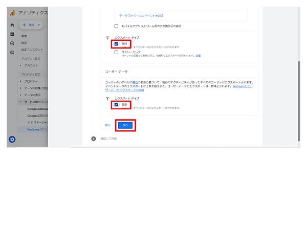 (8)「イベントデータ」の「エクスポートタイプ」で「毎日」「ユーザー データ」の「エクスポートタイプ」で「日別」を選択して、「次へ」をクリック