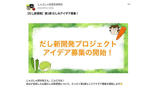 2023年7月、コミュニティ参加者からしゃぶしゃぶの出汁のアイデアを募集開始。すると、すぐに80以上のアイデアが集まった。翌8月には「実際に食べてみたい出汁」の投票を行い、お盆明けに選ばれた5つのアイデアを発表した。