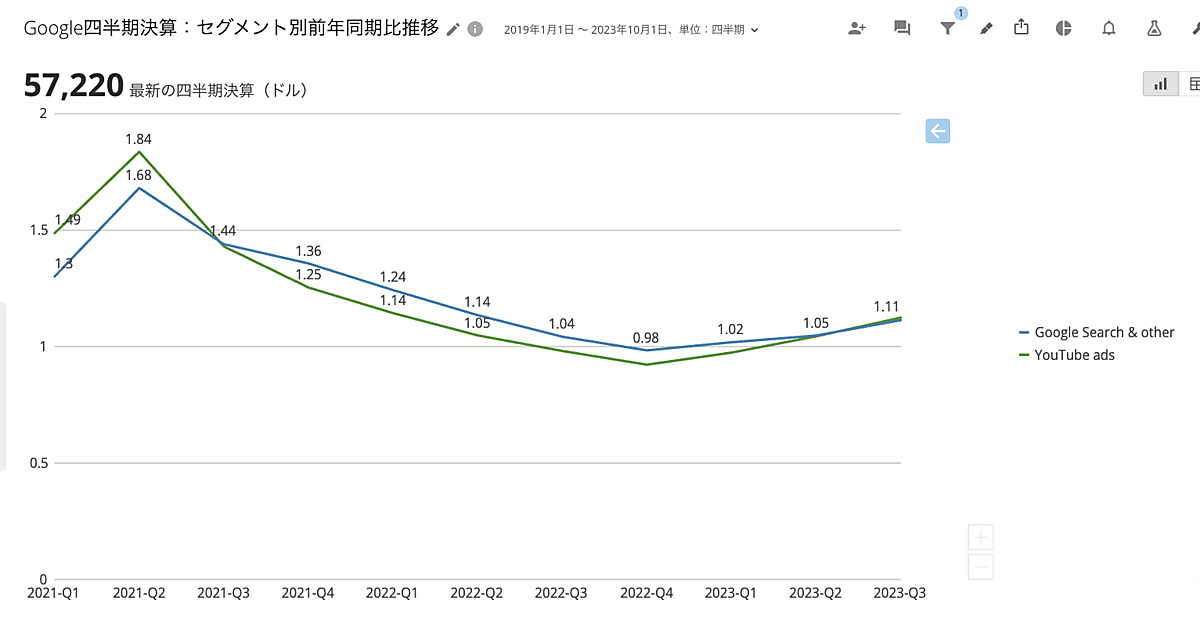 となり、Other Bets(290.71%)、Google Cloud(125.66%)の順に良かったことがわかります。広告事業だけにフォーカスしてみると、Google検索広告とYouTube広告は、下落が始まった2021年後半から2022年に底を打ち、現在は完全に復調していることがわかります。前年同期比を四半期ごとの推移で見ると、それがわかりやすいです。