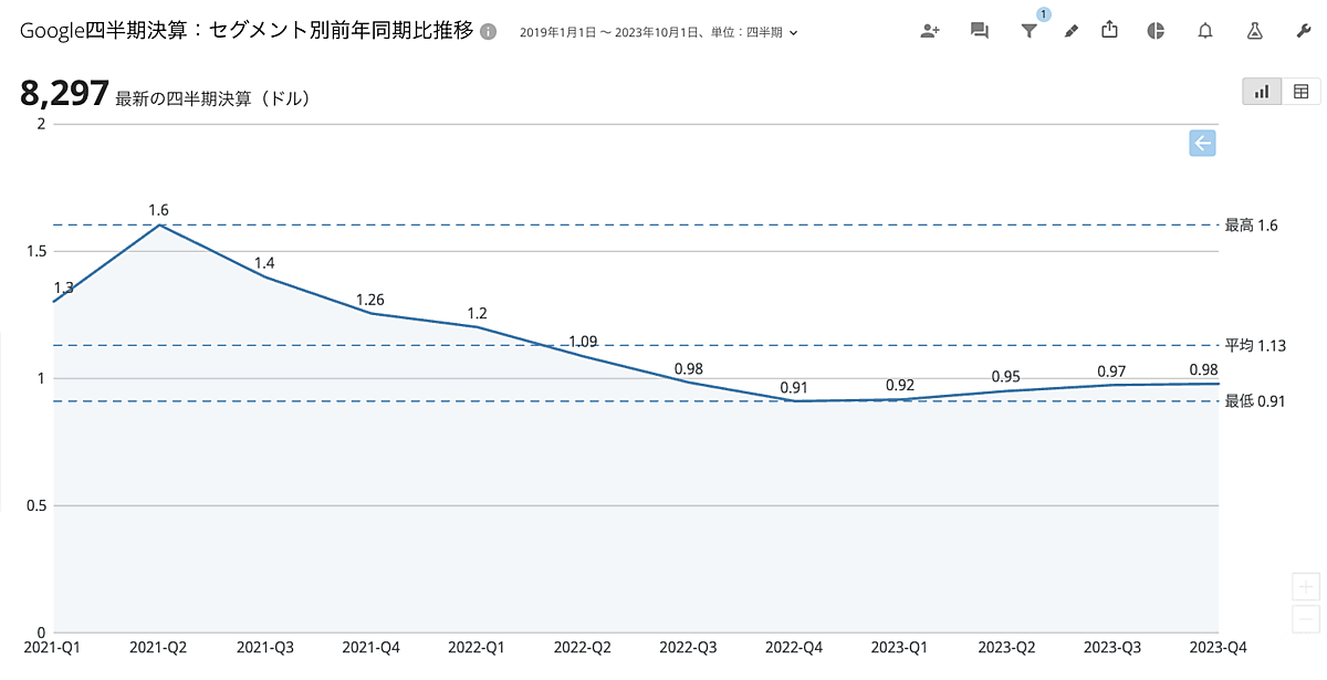 Alphabetの決算情報は2020年度までさかのぼれます(2024年1月現在)。まず、単純に事業セグメントごとの前年同期比を見てみます。