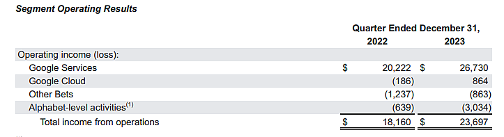 2023年第4四半期に関しては、Googleサービス(広告事業、サブスク、プラットフォーム、デバイスの合計)が全体の利益をけん引しています。それ以外でいうと、Google Cloudは前年同期は赤字だったのがようやくプラスが定常的に出るようになり増えてきました。WaymoなどのOther Betsは赤字幅は縮小しましたが、依然マイナス。Aphabet-level activitiesというアルファベット全体に関わる費用に関してのマイナスが大きいのは、ここ最近のレイオフに関連する退職関連費用が大きいためです。