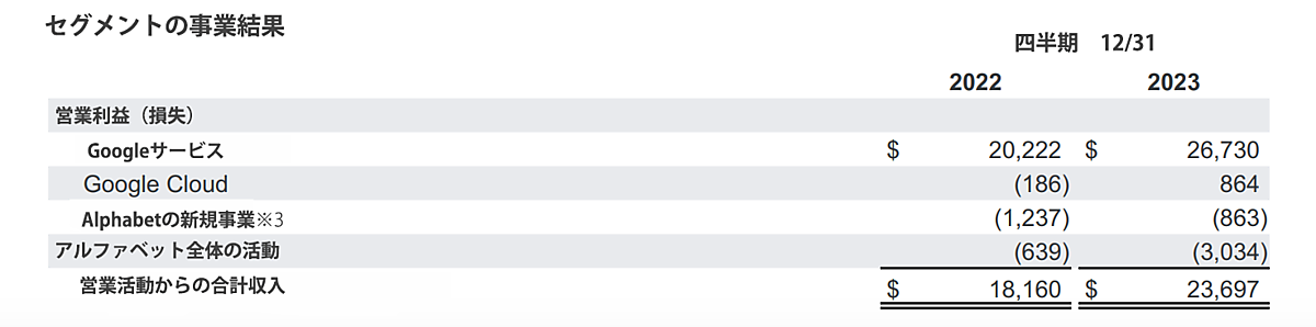 売上を出していても、事業にかけるコスト(サーバー費、人件費、その他)が大きいと、実際は利益が出ていない可能性があります。そのため、事業セグメントごとのOperating Income(営業利益=本業の儲けが出ているかの指標)を確認します。