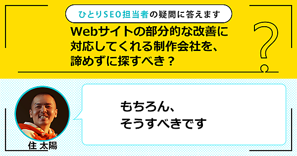ひとりで頑張るSEO担当者さんの悩みに答える本連載。今回の質問は「Webサイトの部分的な改善に対応してくれる制作会社を、諦めずに探すべき?」です。この回答は「もちろん、そうすべき」です。