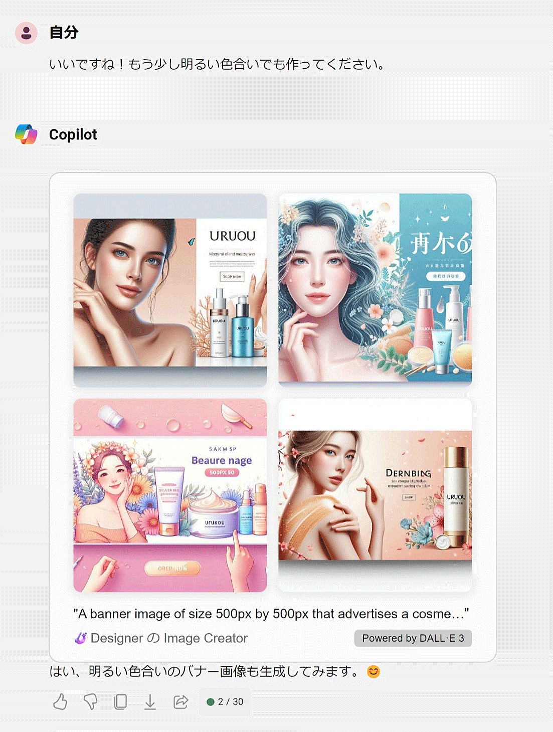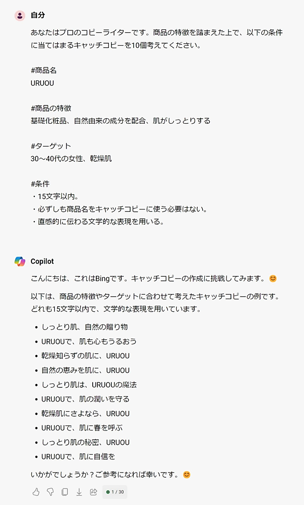 でしょう? それがAIアシスタントのCopilotならではの利点なんです。人間に、「コピー案を10個出せ」「ちょっと違うからあと10個」「もう少し爽やかな感じであと10個」なんて言っていたら、そのうち疲弊してしまいますけど、Copilotならその心配はありません。