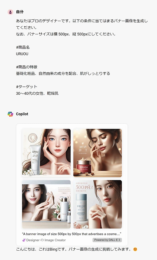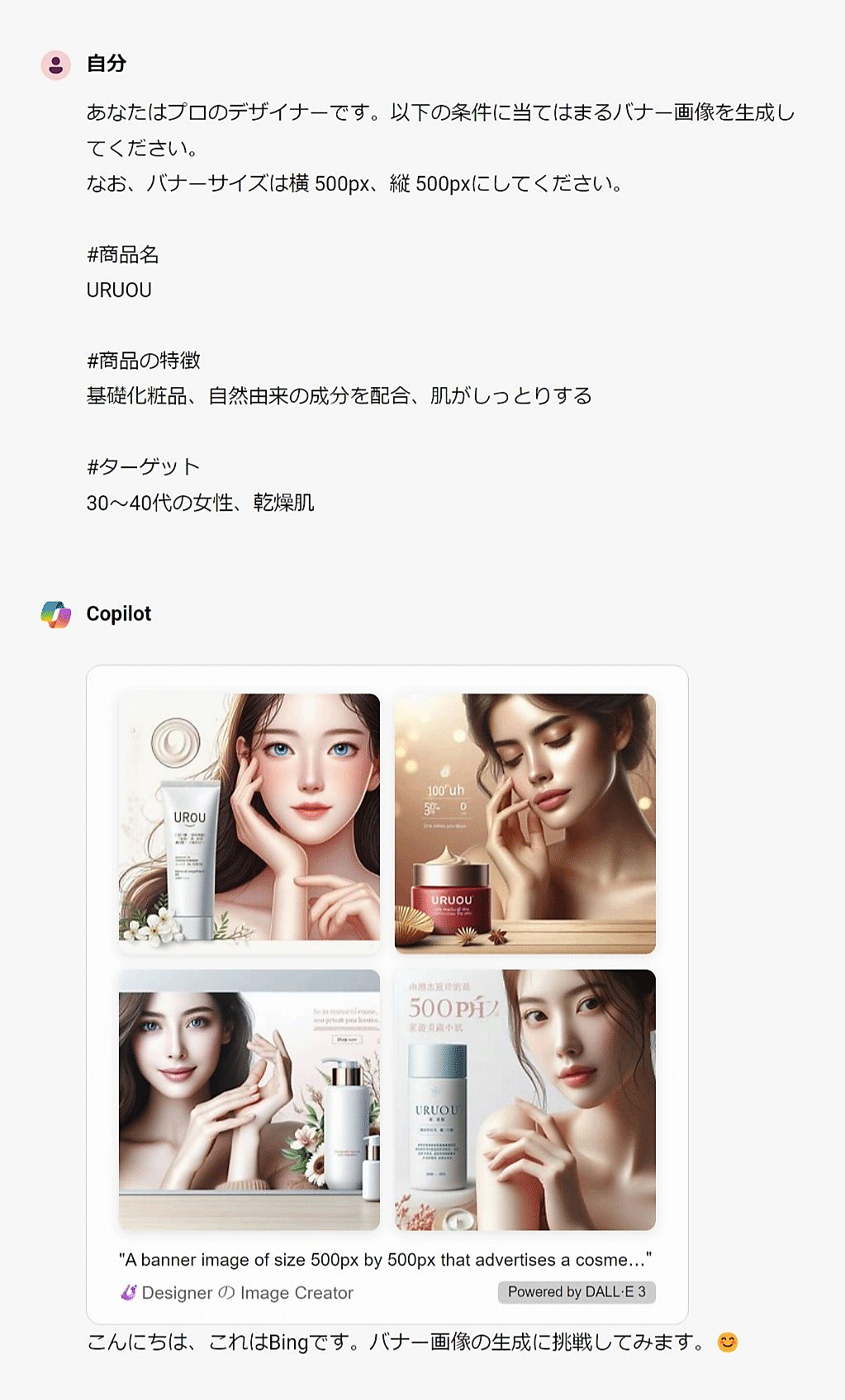 いいですね。これに簡単な条件をつけて、まずはバナー用のキャッチコピーを考えてほしいとCopilotに頼んでみましょう。
