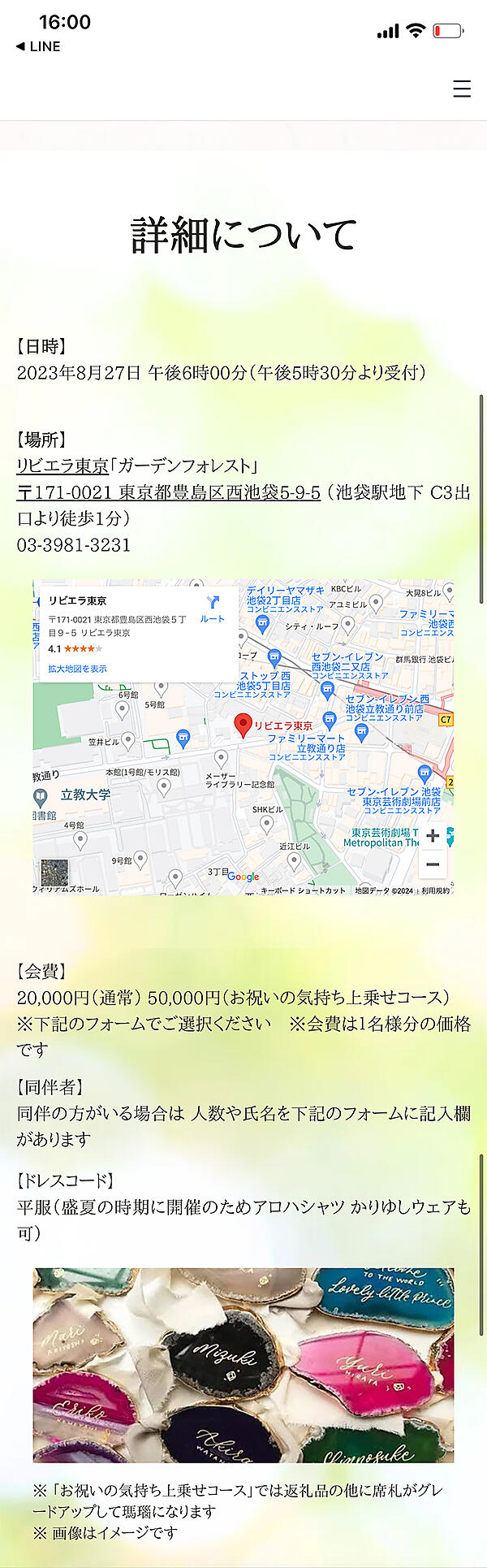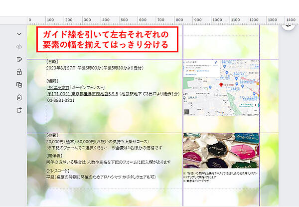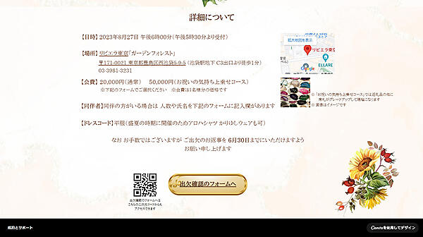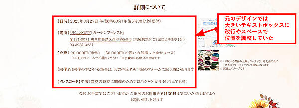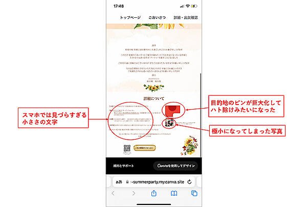 結論から言うと、招待ページ自体は簡単に作成できた。でもレイアウトが上手くいかなかった。それがこちらの画像だ。