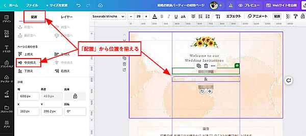 山本さん: このとき、テキストボックスの幅を「配置」から揃えると良いですよ。モバイルに最適化したとき、テキストボックスの幅や大きさによって自動でフォントサイズがかわるので、テキストボックスを揃えておくとレイアウトがずれにくくなります。