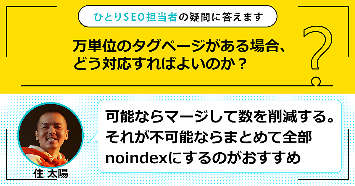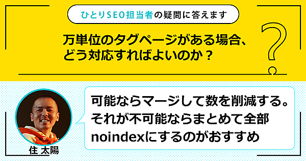 ひとりで頑張るSEO担当者さんの悩みに答える本連載。今回の質問は「万単位のタグページがある場合、どう対応すればよいのか?」です。この回答は「可能ならマージして数を削減する。それが不可能ならまとめて全部noindexにするのがおすすめ」です。さらに質問者さんは「この対応を実施するための社内稟議を通す方法」にも悩まれているようでしたので、それにもお答えしています。