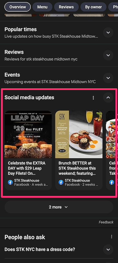 ソーシャル メディアのリンクが関連付けられているビジネス プロフィールには、そのソーシャル メディアの投稿が自動的にビジネス プロフィールに表示される場合があります。
