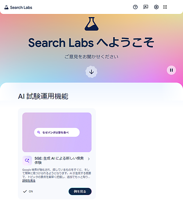 検索結果にSGEの回答が表示されるようにするには、グーグルアカウントを取得し、Search Labsに登録したうえで、SGEを有効にする必要がある。