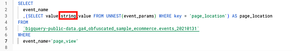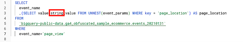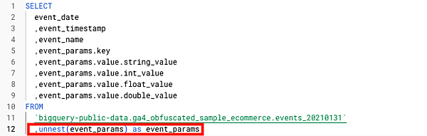 ,(SELECT value.int_value FROM UNNEST(event_params) WHERE key = 'ga_session_id') AS ga_session_id ---ネスト(入れ子)構造を解消