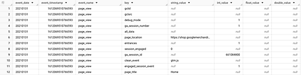 下記の画像の場合、「page_view」というイベントで1行のデータが形成されていますが、その1行のなかにさまざまなイベントパラメータのデータがネスト(入れ子)形式で複数行入っています。