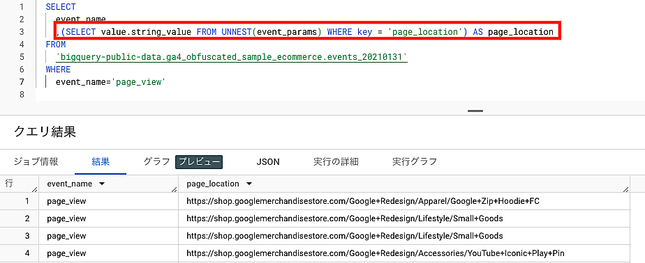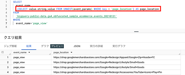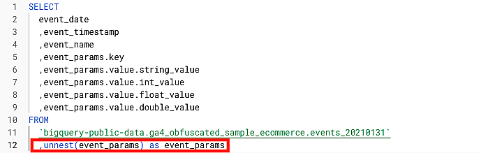 実際にGA4のデータをクエリで抽出する場合は、取り出したいイベントパラメータの値にあわせて、SELECT文内で「unnest関数」を使用することもあります。
