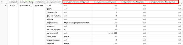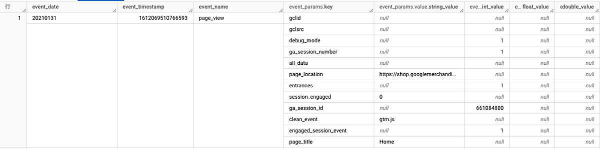 「ga_session_id」というkey(パラメータ)に対して、「INTEGER型(数字型)」の列にidの値が入っています。